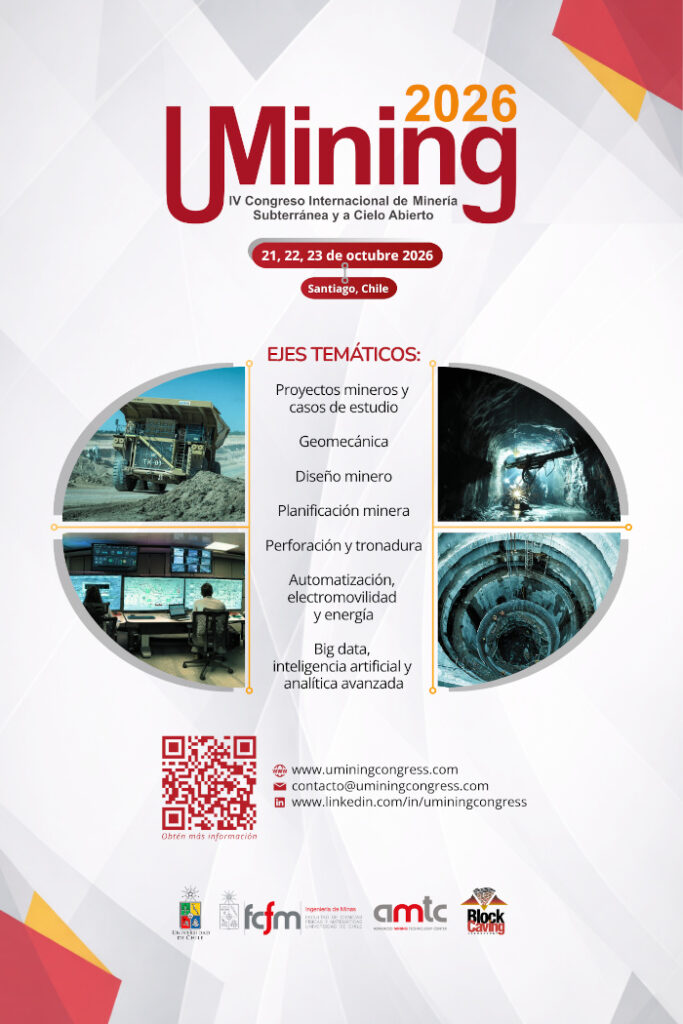 Organizado por el Departamento de Ingeniería de Minas y el Advanced Mining Technology Center, ambos pertenecientes a la Facultad de Ciencias Físicas y Matemáticas de la Universidad de Chile, uno de los polos de formación e investigación minera más relevantes de Latinoamérica, UMining 2026 se posiciona como un espacio altamente especializado que conecta directamente a la industria con la academia y la innovación tecnológica.