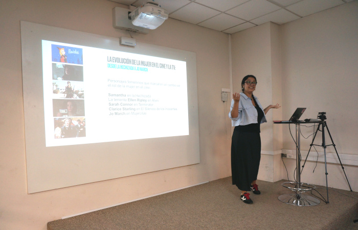En su presentación, Ángela Díaz hizo una breve introducción sobre la manera en que la mujer ha sido representada en el cine y la TV (mayoritariamente con roles restringidos y poca agencia), para pasar a cómo es el retrato en el mundo laboral: según el Foro Económico Mundial, solo el 24% de las películas centradas en el trabajo tienen protagonistas femeninas. “El mismo estudio descubrió que en las películas sobre vida laboral, los personajes masculinos ocupan altos puestos en negocios, deportes, política y ciencia, mientras los personajes femeninos solo lideran en moda, cocina o periodismo”, especificó.