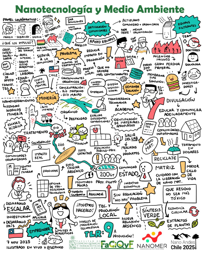 En la ocasión, la Dra. Quintero fue parte del foro “Nanomateriales y Medio Ambiente: Innovación sostenible bajo regulación responsable”, el que también integraron la M.Sc. Dayana Capcha, de la Escuela Militar de Ingeniería de La Paz, y el Dr. Sebastián Salazar, del Departamento de Química Orgánica y Fisicoquímica de la Universidad de Chile. La instancia de conversación tocó temas como la relación con comunidades en la investigación científica, escalamiento de proyectos desde la etapa de laboratorio, las dificultades del trabajo en terreno con contaminantes, reusabilidad de materiales novedosos para remediación y colaboración internacional en investigación sobre nanotecnologías.